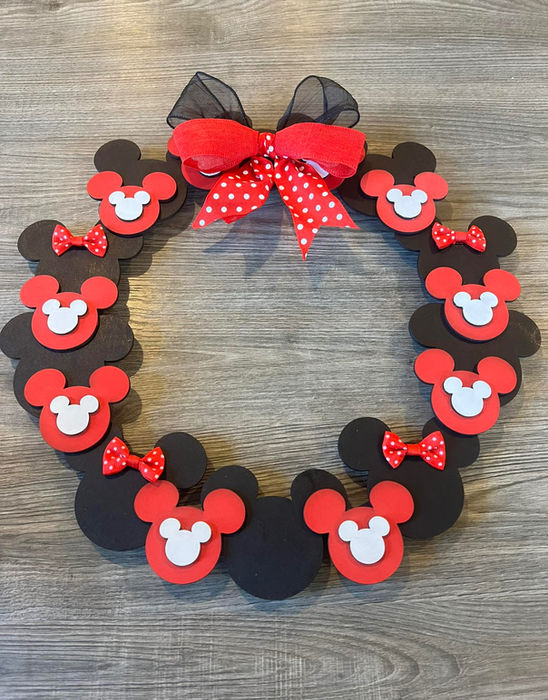 The base of this wreath is 12" round but will be much larger once the pieces are added to the wreath. Each mouse is made out of 1/8 mdf wood. The ribbon design may vary and each sign includes 4 mini red/white polka dot bows.